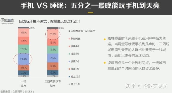 虽然下班早,但睡得并不早。三四线城市的网民似乎更加缺乏自制力,超过五分之一有刷手机到天亮情况。