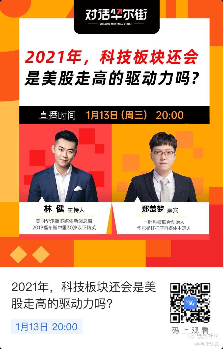 又要和大家见面了!1月13号晚上8点,直播和大家探讨2021年美股的走势,特别是科技板块的展望。大家可以通过下图扫码加入观看,在线互动,接受挑战!唯一希望的是,2021年,打脸不要被打的太狠。[可爱]