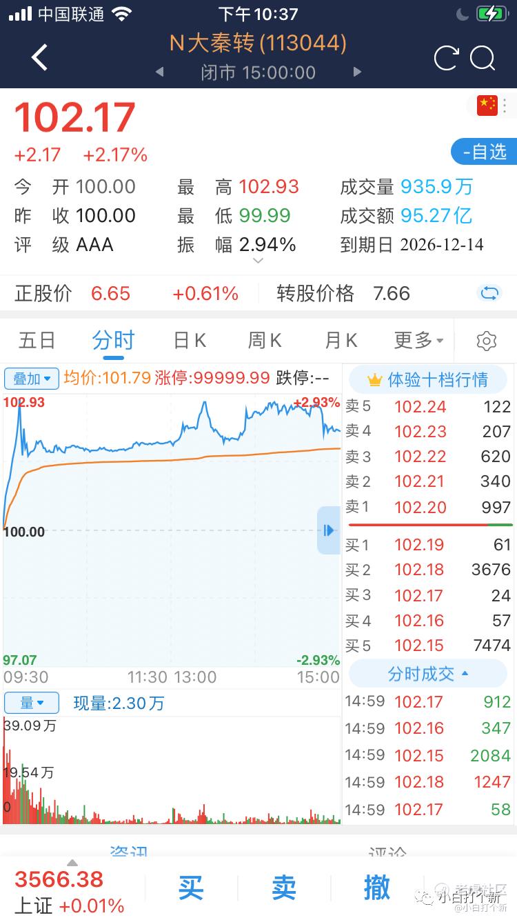 小白预估的大秦的开盘合理价格是105元,但大秦转债实际开盘价100元,盘中最高102.93元,收盘价格102.17元。秦上市首日走势如下: