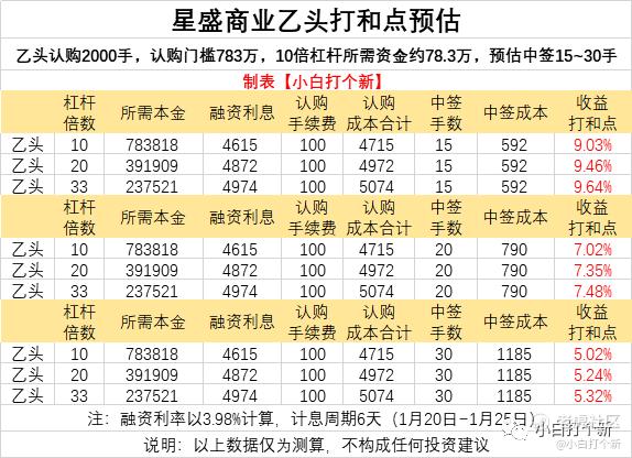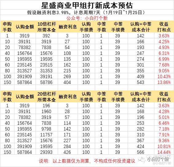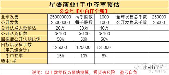 1手中签率预估:截止发文时,星盛商业融资认购已超过200倍。考虑到近期的新股热度,小白预计星盛商业的申购参与人数20~40万,回拨50%后甲乙组合计12.5万手,一手中签率约为8%~15%。