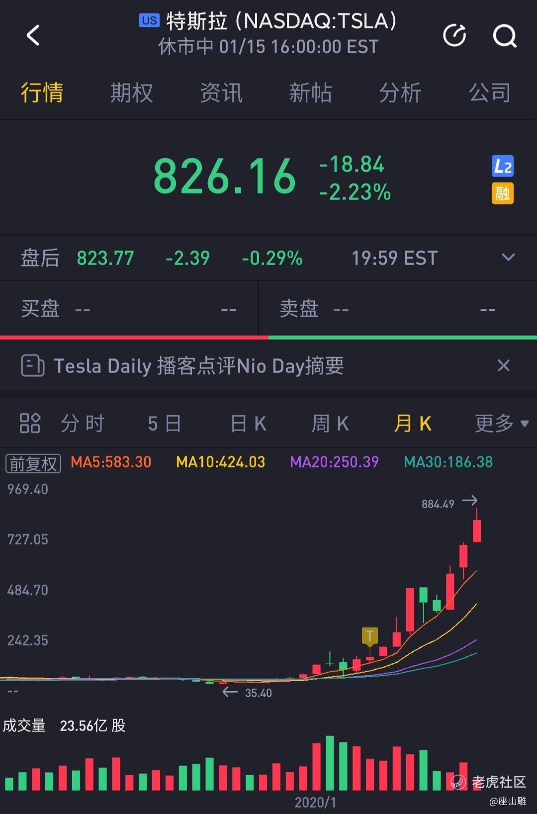 近期也在研究马斯克所遵循的第一性原理的思维,回归到实处,我进入美股,其实是无意当中做出了一个正确的方向性的选择,这个方向是对的,是正确的,可惜没有走。我前期的一篇文章里,做过说明,我为什么进入美股,进入美股就是马斯克,就是奔他的特斯拉股票而来,假如以 2019年11月1日入市的1035美元,买入特斯拉的股票。当时我只能买16股(以除权价计算),那么到上周五,它的价格是825美元。市值是13216美元,可以看看特斯拉的月线。