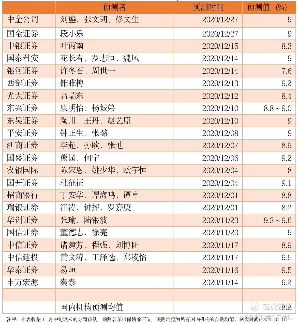 现在市场情绪高涨,因为形势实在一片大好:A股终于冲破3500点,交易量破万亿,人民币持续升值,宏观数据看着也挺不错,各大券商从11月以来发布的对2021年GDP增速的预测都在8%以上,均值高达8.8%。