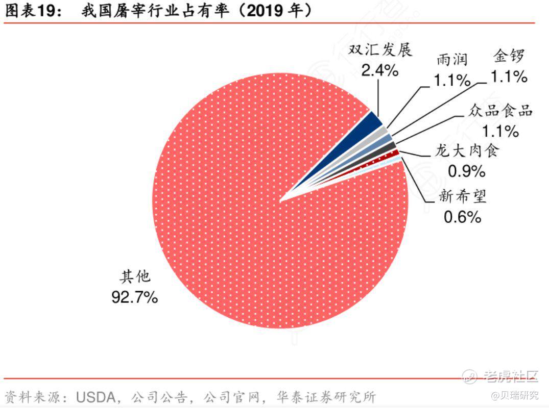 下图是屠宰行业的竞争格局。可以看到,屠宰行业的集中度非常之低,作为龙头的双汇仅占据2.4%的市场份额,行业前6的市场份额加起来也只有7.2%。