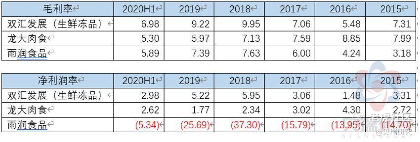 其次,表现在盈利能力上,我们看到,几家主要的上市公司的盈利能力都非常差。毛利率一般都在10%以下。净利润率角度,双汇、龙大肉食虽然没有亏损,但是净利润率仅有3%上下;雨润食品(港股)则已连续亏损了5年,如果换做国内上市,早就已经退市。