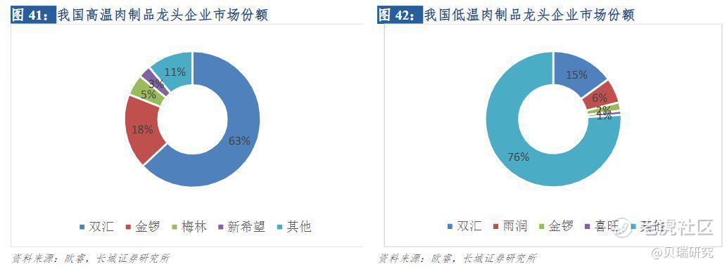 总的来说,肉制品行业更加倚重渠道和品牌,因此拥有一定的定价权,行业竞争格局也相对好很多。下图中可以看到,双汇在高温肉赛道是绝对的王者,而在低温肉赛道,也是一骑绝尘,大幅领先第二梯队。