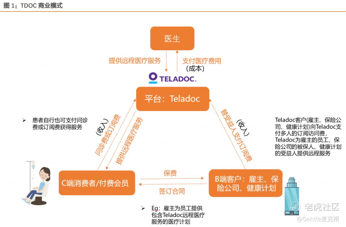 Teladoc以 B2B2C 模式提供服务:Teladoc 的商业模式主要是与大型企业或保险公司签约(B2B)并由其支付订阅会员费,同时也通过产品组合中的消费者平台直接面向消费者提供服务。