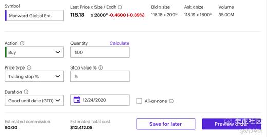 只需选择追踪止损百分比,输入你喜欢的数字,然后确保将交易持续时间设置为“取消前有效(Good until canceled)”(GTC)或设置几个星期的适当日期即可。(你不太可能希望仅将订单保留一两天。)