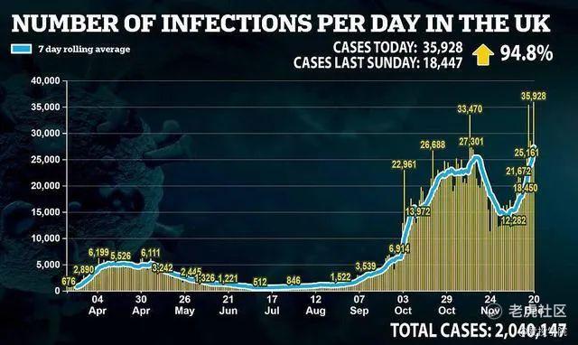自10月下旬以来,英国每日新增病例再次激增 图源《每日邮报》