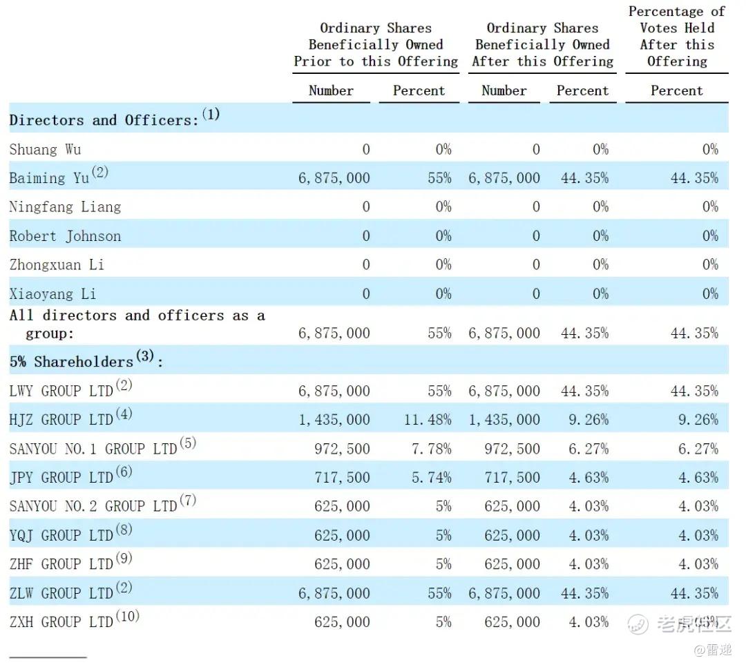 IPO后,余百明(Baiming Yu)及其妻子章莉维Liwei Zhang控制44.35%股权;HJZ GROUP持有9.26%股权,SANYOU NO.1 GROUP LTD持有6.27%的股权;金佩瑶Peiyao Jin通过JPY GROUP持有4.63%的股权;SANYOU NO.2 GROUP持有4.03%的股权;