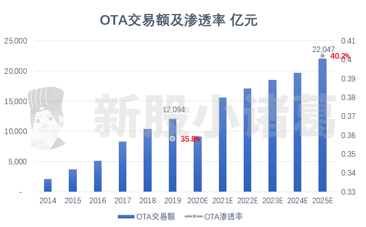 2019年OTA总交易规模1.2万亿元,渗透率35.8%。艾瑞咨询预计2025年OTA总交易额将会达到2.2万亿元,较2019年有82%的增长空间,渗透率也会达到40.2%。