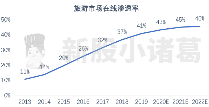 中国旅游市场在线渗透率从2013年的11%上升至2019年的40.9%,对比英国在线渗透率为64%,仍有较大提升空间。
