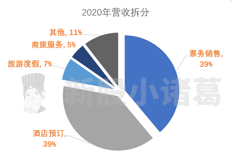 2015-2019年,公司营业收入稳步增长,年复合增长率25%。2020年受到疫情的影响,同比下滑49%。2020年,公司的营收来源是票务销售和酒店预订,分别占比39%,旅游度假、商旅服务和其他业务占比7%、5%和11%。