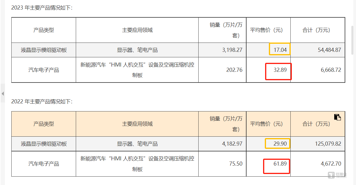 从数据也可以看出,南京熊猫2023年的液晶显示模组驱动板由2022年的4182.97万套减少至3198.27万套,而汽车电子产品由2022年75.5万套增加至2023年的202.76万套。