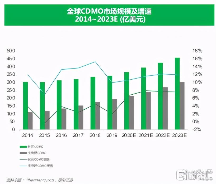 在大型药企外包比例持续提升、中小药企外包需求强烈的共同作用下,全球药物研发管线数量和全球CDMO市场的规模都将持续高速增长。据Pharmaprojects预计,全球CDMO市场规模将在2023年前达到450亿美元的规模。