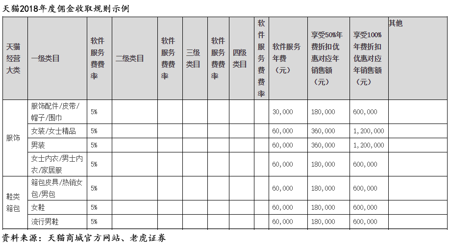 和自营不同,平台型的电商模式没有库存、销售压力,属轻资产运营模式。该类模式在规模先发的优势基础上可以获得充沛的投入回报比。例如,阿里巴巴在淘宝上会对营销推广需求的商家收取一定的广告费用,该等服务是有限期限服务,在此基础之上,天猫还向商家收取一定的佣金费率。该等费率是固定收取,且与销售额紧密挂钩。
