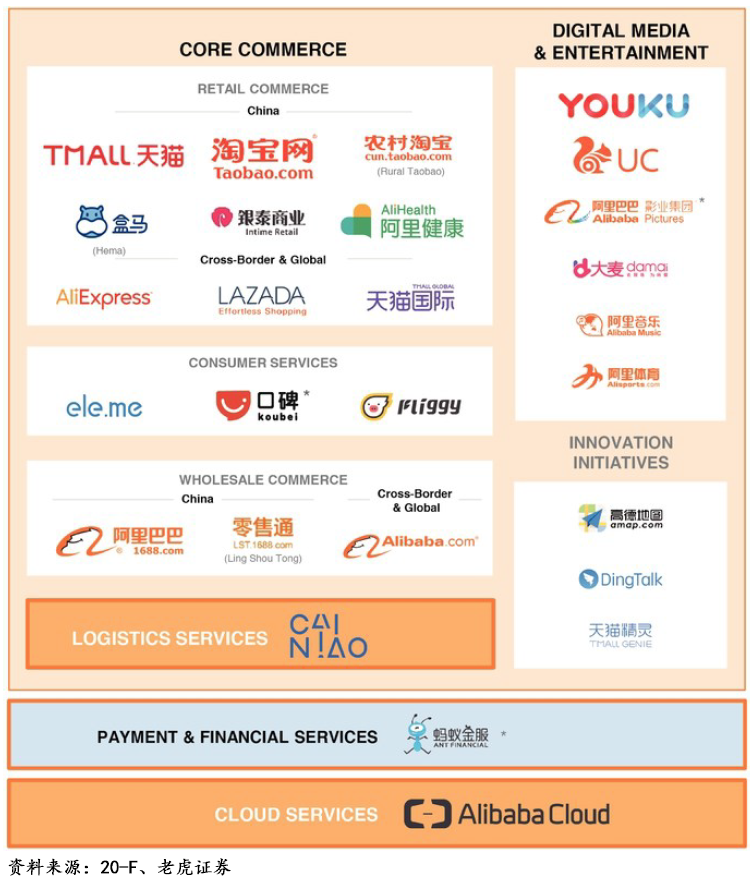 阿里巴巴$(BABA)$将旗下业务分为以下几类,分别为核心商业、客户服务、商业批发、物流服务、数字媒体与娱乐、创新、支付与金融服务、云服务。其中核心商业包括天猫、淘宝网、农村淘宝、河马生鲜、银泰商业、阿里健康、阿里速卖通、天猫国际、Lazada(于东南亚区域开展业务的电子商务公司),之所以称之为核心商业概其中大部分和电商有关且充分盈利。