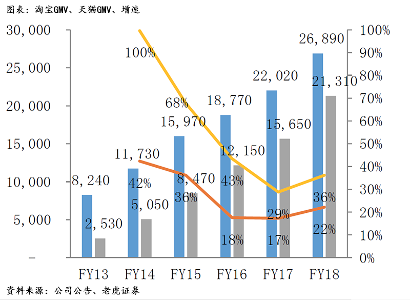 2.1 国内最大的电子商务公司作为国内最大的电商平台,2018财年淘宝与天猫的合并GMV达到48200亿元,市场份额超过65%。该等先发优势在于大规模产生的品牌效应,此类品牌效应吸引了更多商家入驻,更多的商家又吸引了更多的消费者,这样形成了一个闭环的增益促进生态。