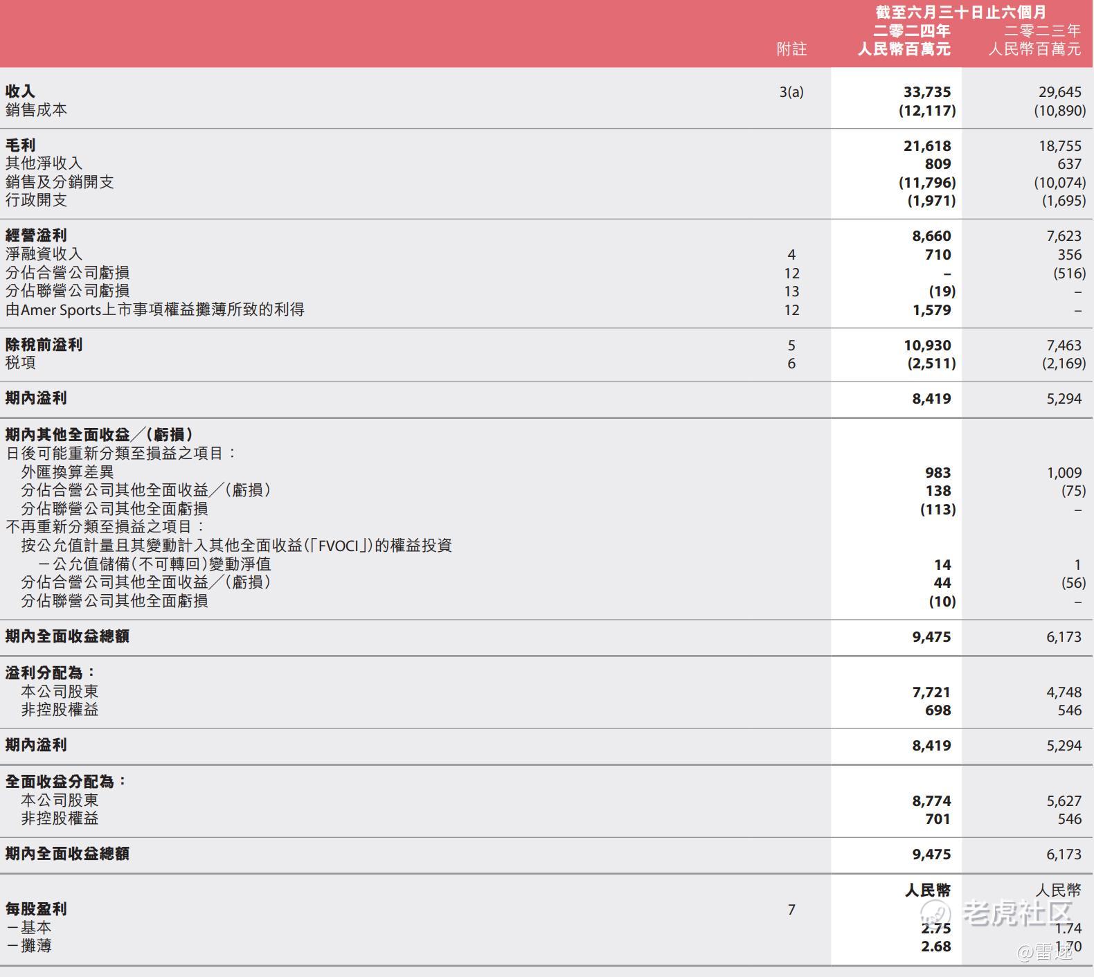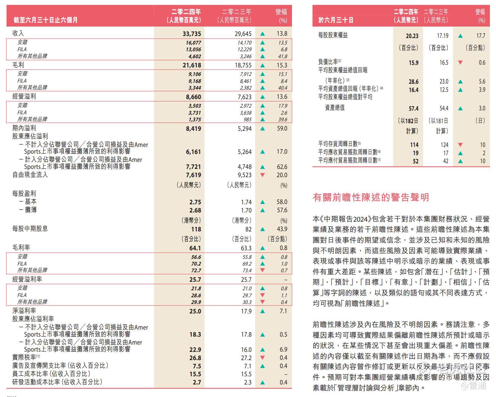 安踏体育2024年上半年期内利润为84.19亿元,较上年同期的52.94亿元增长59%。安踏体育2024年上半年股东应占盈利为77亿元,较上年同期增长62.6%。