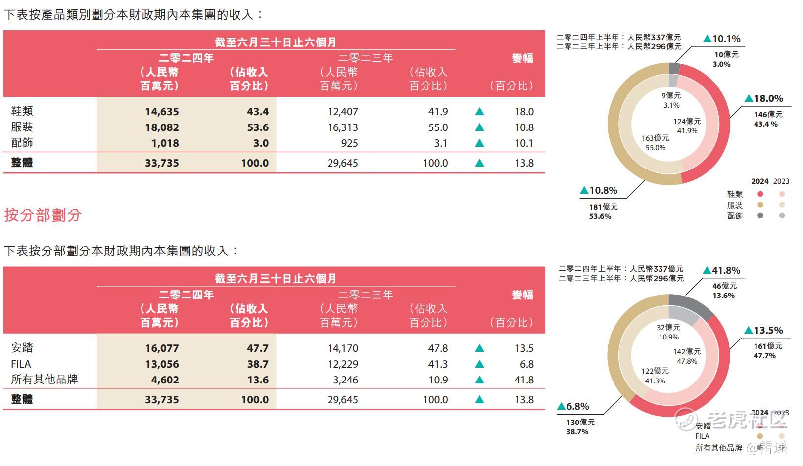 其中,安踏2024年上半年营收为160.77亿元,较上年同期的141.7亿元增长13.5%,占营收的比例为47.7%;FILA分部营收为130.56亿元,较上年同期的122.29亿元增长13.5%,占营收的比例为38.7%;其他品牌收入为46亿元,较上年同期的32.46亿元增长41.8%。
