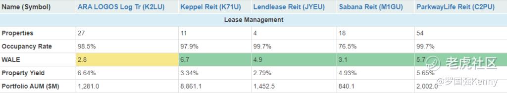 - Weighted Average Lease Expiry (WALE): The 2 Industrial/Logistics REITs have lower WALEs at 2.8 years and 3.1 years respectively. The other 3 REITs in the other sectors have WALEs all above 4.9 years.