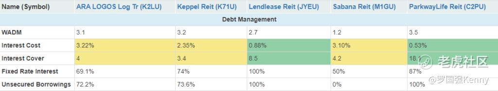 - Interest Cost/Cost of Debt: Lendlease REIT and ParkwayLife REIT have a very low Cost of Debt of less than 0.9%. The other 3 REITs have Cost of Debts hovering around 2 to 3%.