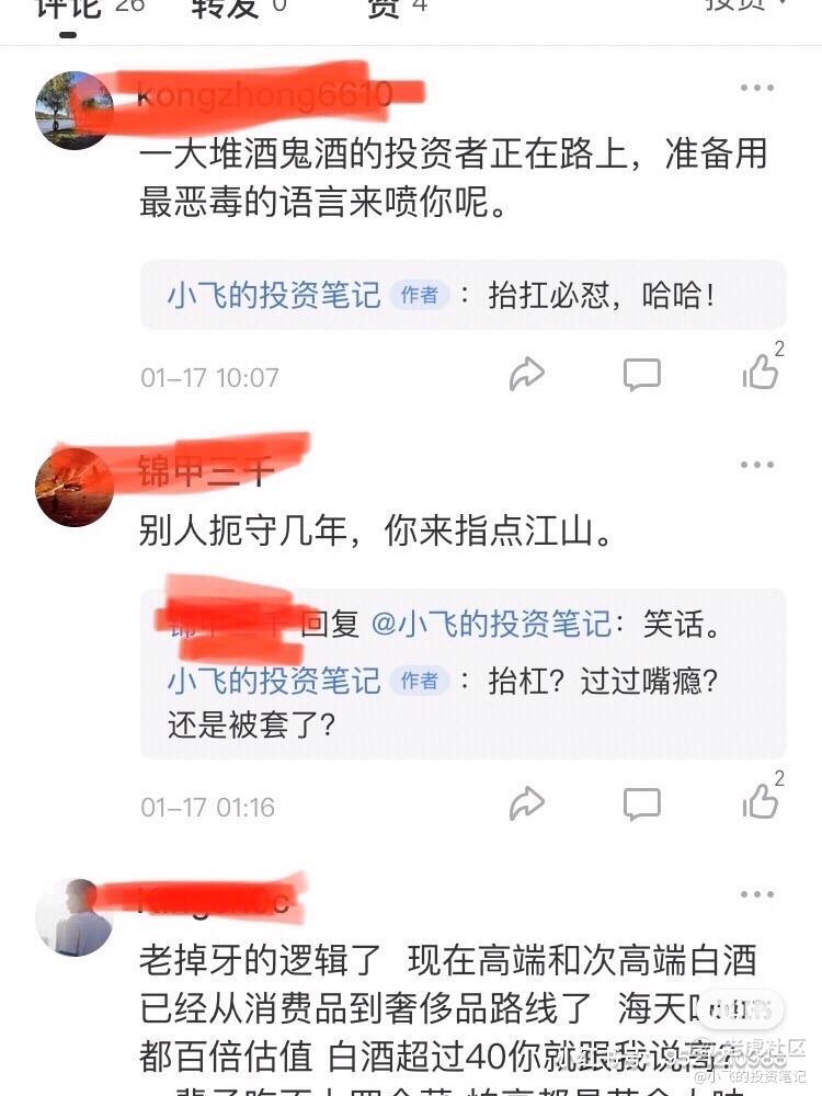 再比如,我在1.16 酒鬼酒跌下神坛,泡沫还是假摔?同时把我的估值过程分享在了**社区上,那是酒鬼酒200元左右,我说如果在基本面不变化的情况下也就100左右,接近腰斩,结果被喷了好几天,但是没关系,我都怼回去了,哈哈,我只接受严谨的估值逻辑,抬杠必怼,后来的剧情大家都知道了,酒鬼酒从220直接跌到120,最近因为业绩超预期,又开始反弹,当然这是后话,估值的是随着基本面的变化而变化的。