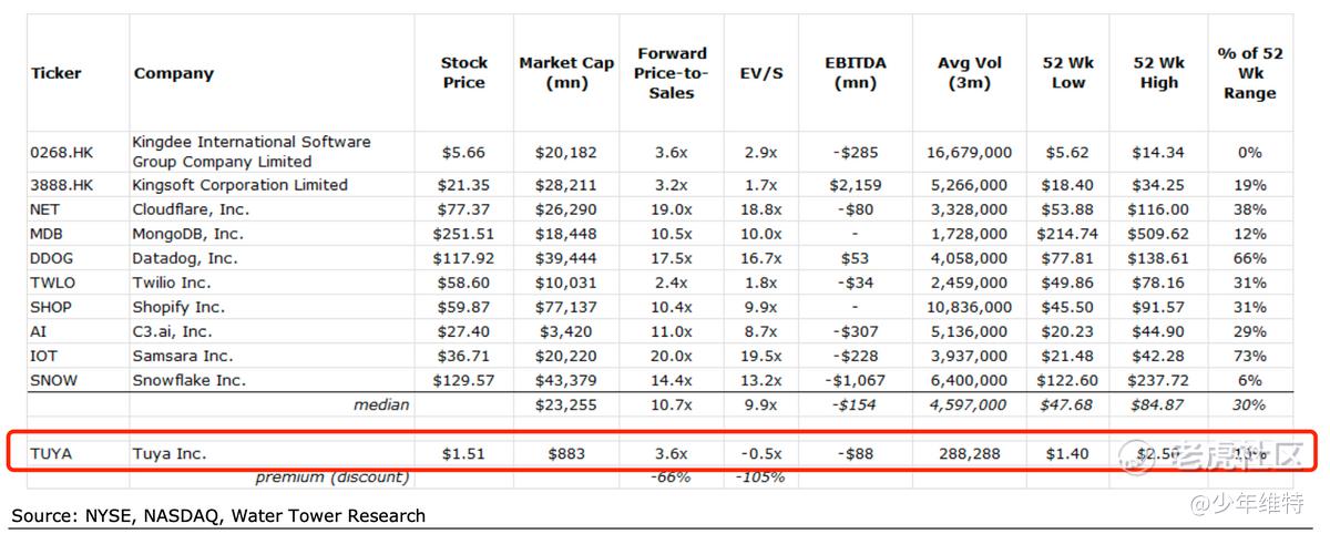 - 孤独翱翔·2024-09-18精彩按照7月Water Tower Research给的估值,可比标的PS中值为10.7倍,而涂鸦为3.6倍,按照9月13日收盘,对应PS为2.58倍,目前涂鸦尚处在严重低估状态。$涂鸦智能(TUYA)$ $涂鸦智能-W(02391)$1举报