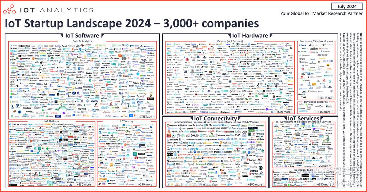 根据IoT Analysis报告,2024年IoT领域初创公司达3000多家,具体到IoT平台(上图左下角),有超过630家。