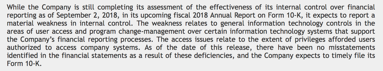 大致内容是说该公司在信息技术控制这方面有很大的缺陷,这个缺陷预计将在2018年度财报中公布。 而这件事也是我们需要在2019Q1财报中所关注的,因为上个季度财报中有说明,这个缺陷正在修补过程中,我们需要了解该缺陷的修补进度。