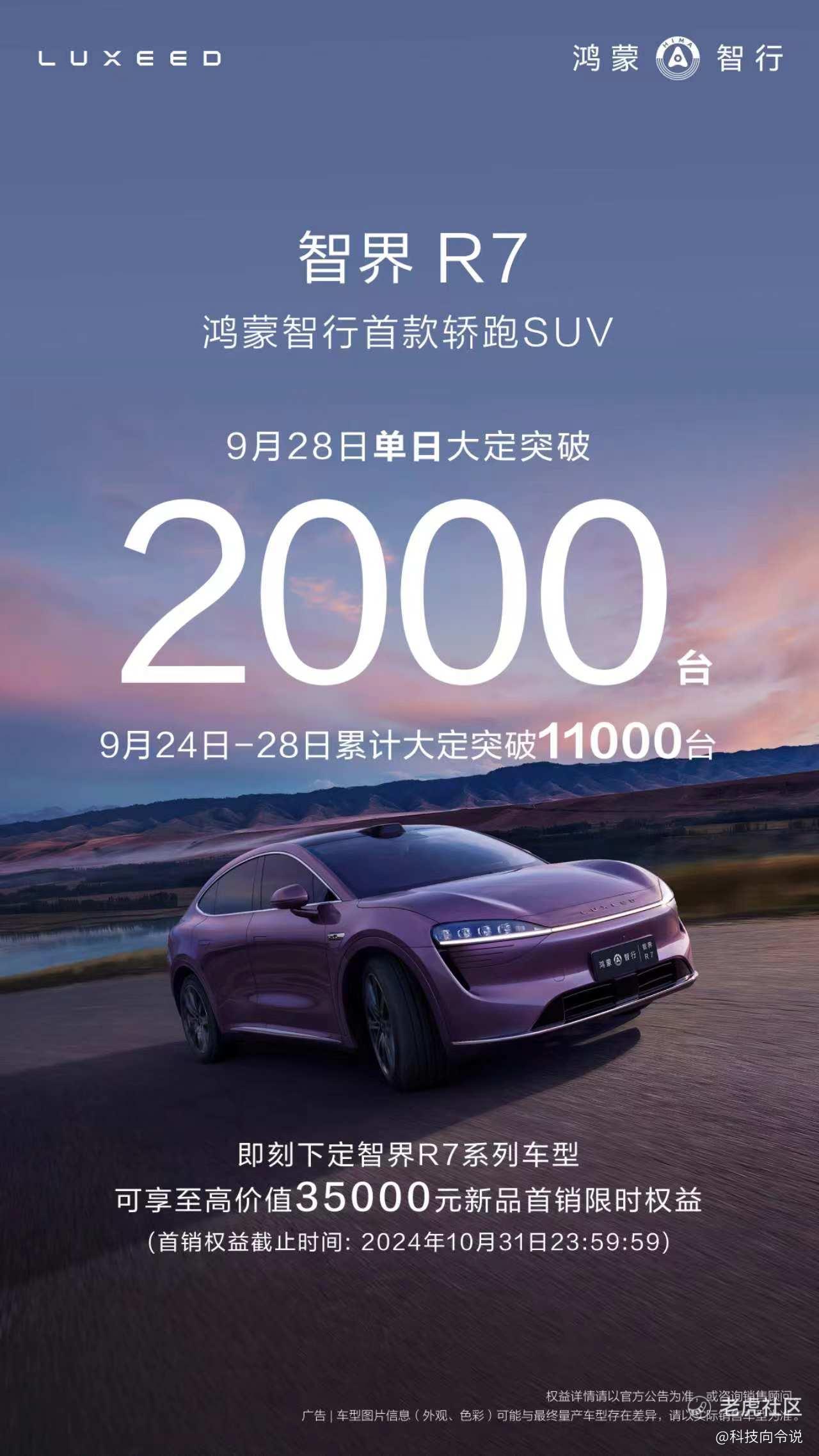 智界R7单日大定2000台,这是真的猛,他是唯一硬刚Y的,其他几款包括乐道L60、阿维塔07、极氪7X,都还是在价格上做了让步,说到底还是走性价比路子, 只有智界R7的价格怼着model Y干,华为是真的头硬,没想到还赢得这么理直气壮,接下来就看奇瑞的交付了。奇瑞要抗住啊。