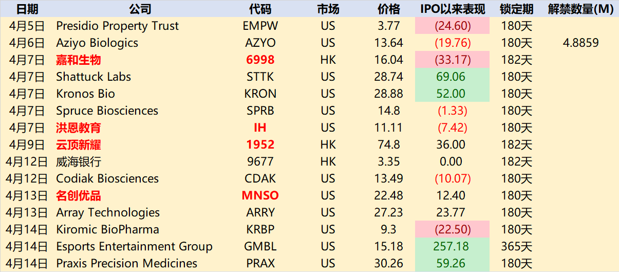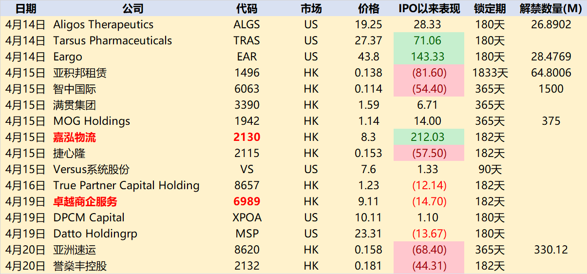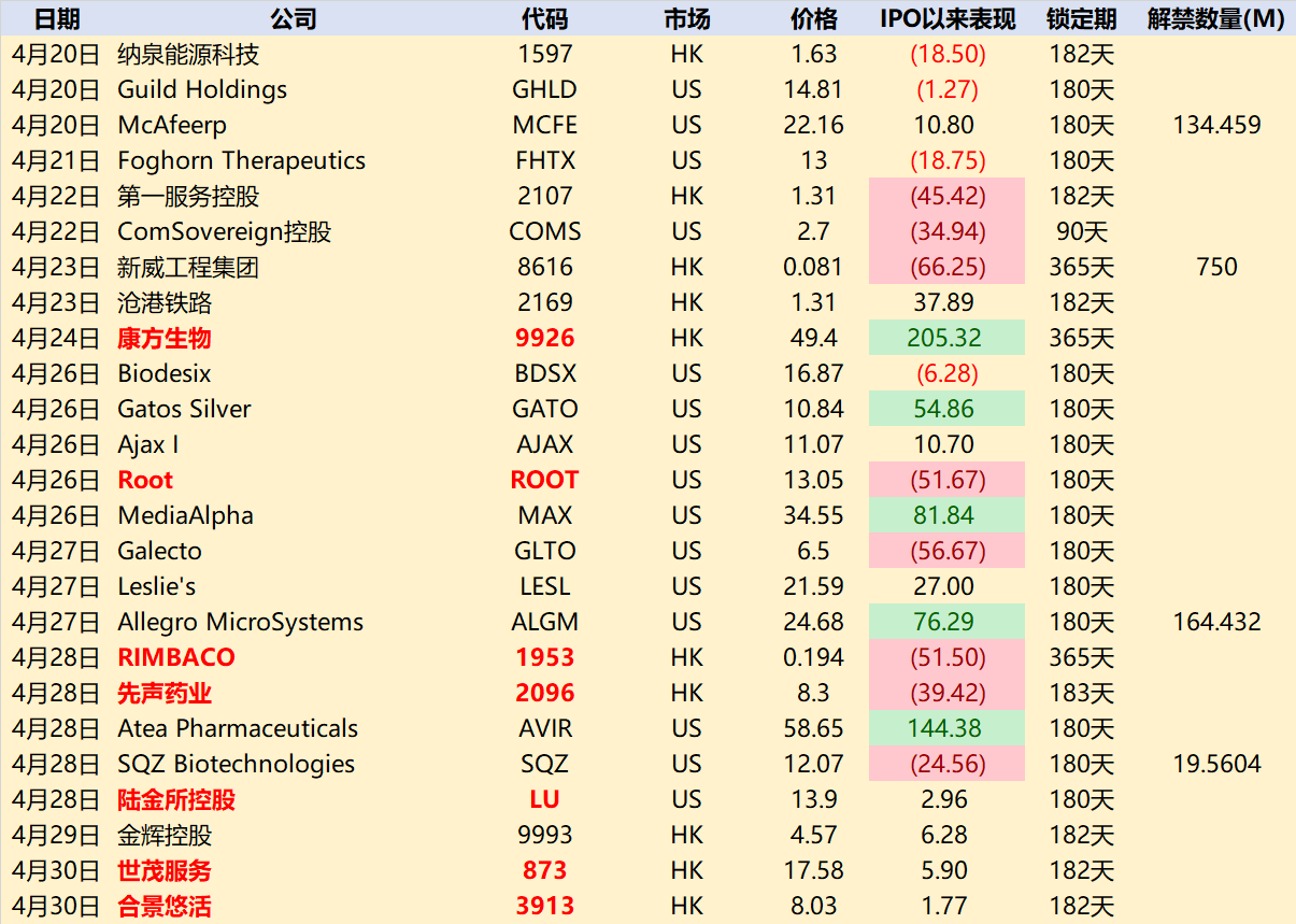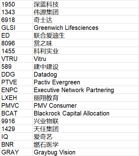 其中,$合景悠活(03913)$$世茂服务(00873)$$陆金所(LU)$$先声药业(02096)$$RIMBACO(01953)$$康方生物-B(09926)$ $第一服务控股(02107)$ $卓越商企服务(06989)$ $嘉泓物流(02130)$ $名创优品(MNSO)$ $云顶新耀-B(01952)$ $洪恩教育(IH)$ $康方生物-B(09926)$ $卓越商企服务(06989)$ $嘉泓物流(02130)$ 这些都值得关注。