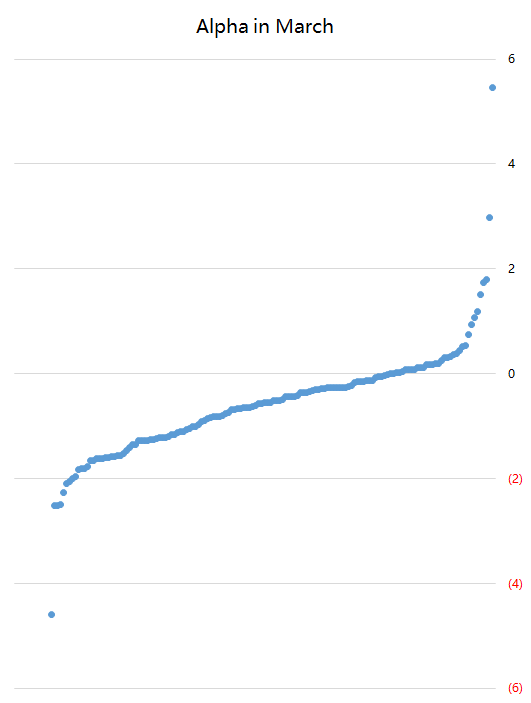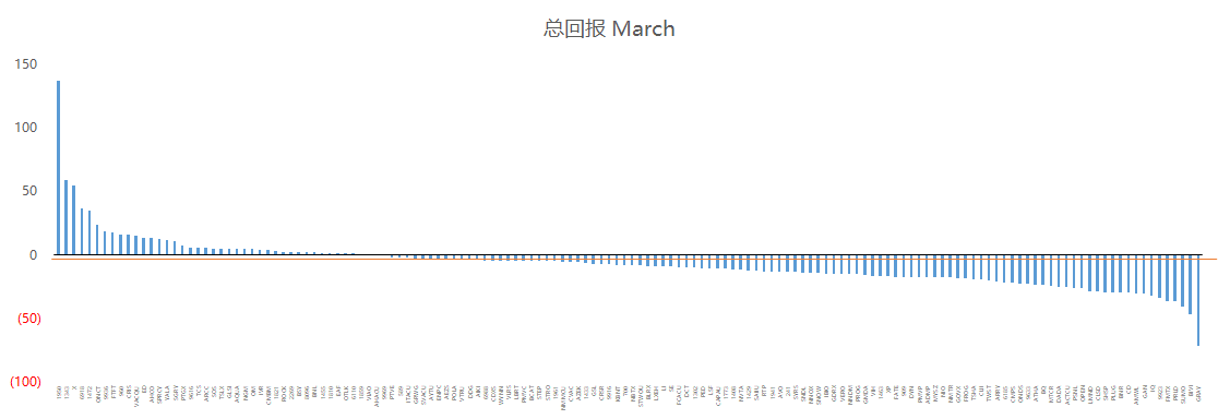 三月份的行情整体是分化的,我们以月初到3月30日收盘计,恒生指数总回报-1.39%,纳斯达克-1.11%,而标普却有3.87%