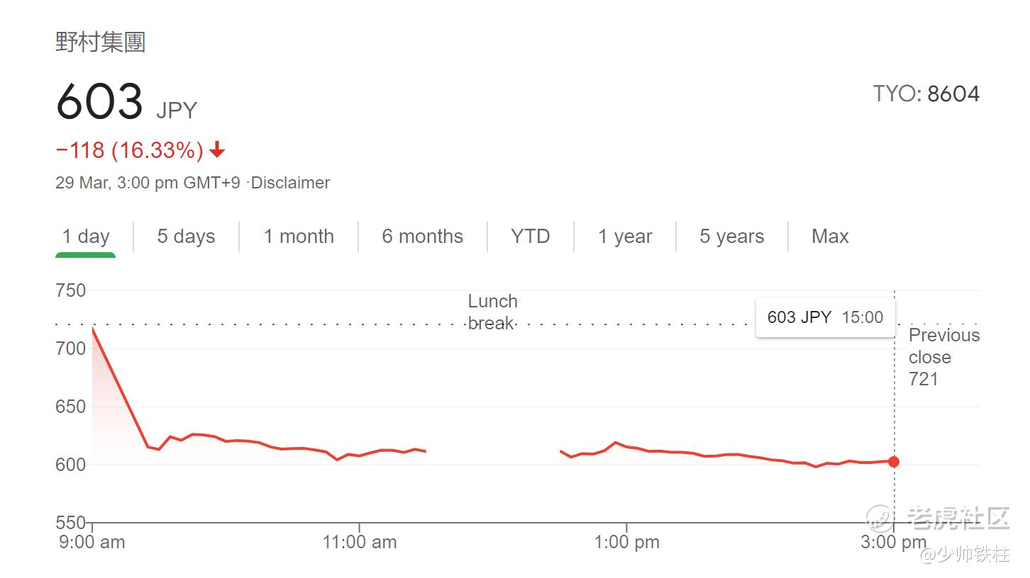 周五那个故事的梗概:小岳岳有个失散多年的兄弟,叫Bill Hwang,大概本金有150亿美金,看了阿基米德的传记后,上了很大的杠杆,结果持仓股票的股价下跌,爆仓了。所以,券商通过大宗交易,强平了他手中的票。这件事情九成是真的,因为Archegos资本主要融资的券商是野村证券,今天跌了16.33%: