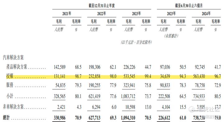 其中汽车解决方案授权的毛利率最高,在94%以上,今年上半年为96.7%。
