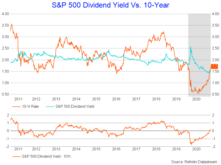 此外,这还是十年来的头一次,美债利率比spx的股息收益率高出约30个基点,这的确使这10年期相对而言更具吸引力。所以如果收益率再不想办法下降,那么spx的股息收益率就需要开始上升,以赶上更高利率的环境。通俗点说就是,假设我投资了1000块去sp500,股息收益率大概在1.45%,但是我要承受股价波动的风险,那我为什么不投资不需要承担价格波动且收益率为1.75%的美债,那如果美债收益率下不来的话,sp500股息收益率要想增加30个基点的话,对应的spx价格大概是3293,所以不要小看这30个基点,对于大盘就是将尽600点的下跌,我放张sp500和10年债的无风险收益率对比图