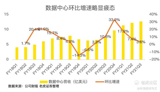 但数据中心业务方面,英伟达遇到了小小的坎坷,三季度数据中心业务营收19亿美元,环比增速只有8%。