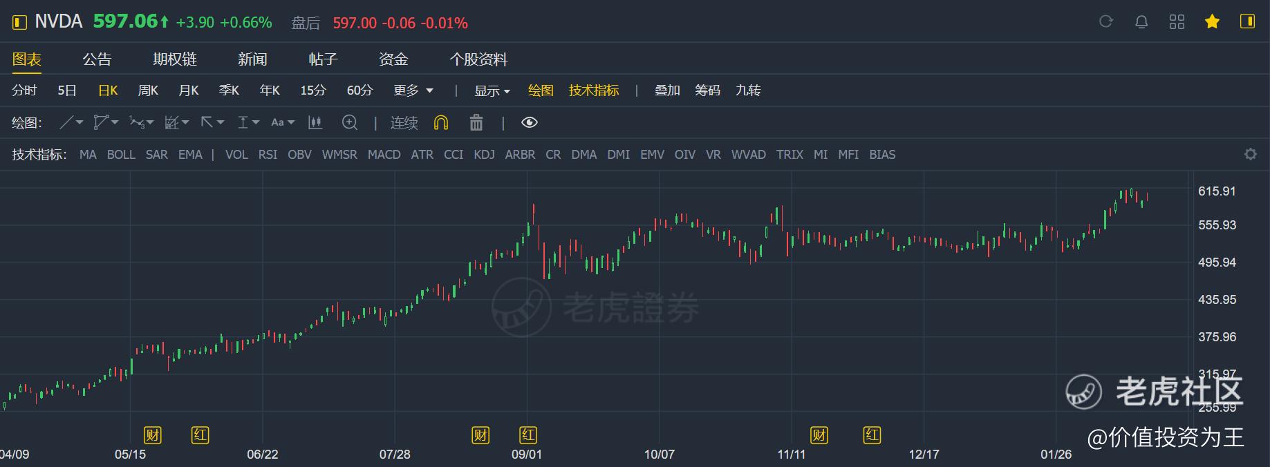 根据预告,英伟达将在北京时间2月25日(下周四)早上6点公布去年四季报,在成绩单揭晓之前,英伟达的股价率先躁动,已于近期创下历史新高并突破600美元大关!