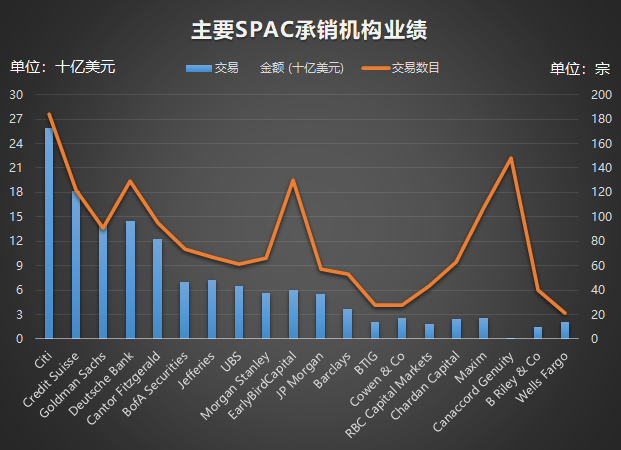 从承销商来看,截止2021年2月的一年,花旗占据了15.1%的市场份额,参与了184宗共计347亿美元的SPAC,其余超过100亿美元的还有瑞信、高盛、德银和康托菲茨杰拉德。