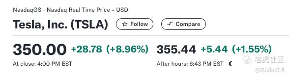 $特斯拉(TSLA)$ 今日股价上涨近9%,收于350美元,创下两年多来的最高收盘价。这一价格距离其历史最高点414美元仍有约18%的涨幅。特斯拉目前市值已突破1万亿美元,超越台积电,跃居美股第七位。