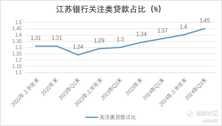 《读懂数字财经》注意到,虽然江苏银行不良率连续多个季度下降,资产质量展现出了穿越周期的优秀成绩,但其关注类贷款却也出现了连续6个季度升高的现象:从2023年一季度末的1.24%一路升高至2024年三季度末的1.45%,总计上升21个BP,同期不良率下降3个BP。