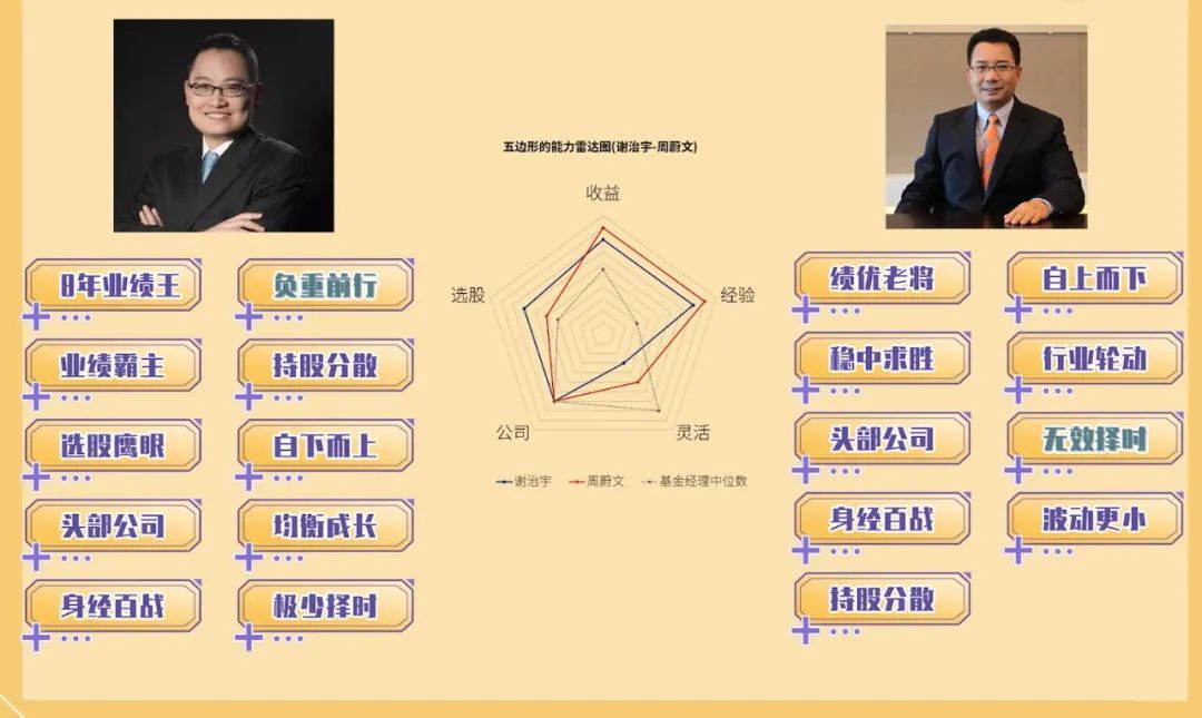 他俩的综合评级都是A级,得分也很接近。谢治宇71分,周蔚文73分。得分是用过去5年的数据来评估的,从5个方面分别打分,经风险调整后的收益、选股能力、经验、基金公司实力、灵活性,最后再加权得出总分和综合评级。