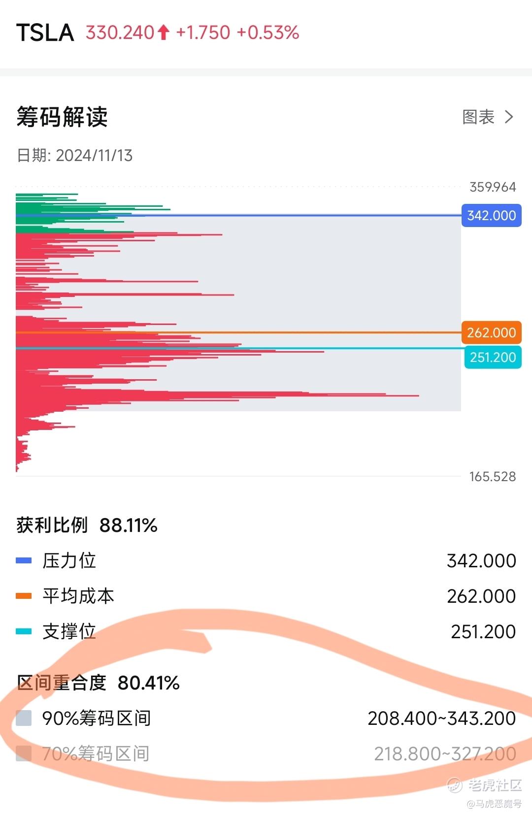 $特斯拉(TSLA)$ 想跟大家聊一聊特斯拉现在出现的一个问题就是现在他的筹码集中度已经到80%了,其实这个其实对于情绪化的股票来说其实是该值得关注了。为什么要值得关注这个就是说现在的大多数的筹码都在这个区间段之内,而现在又是一个回调的一个相对来说的情况。