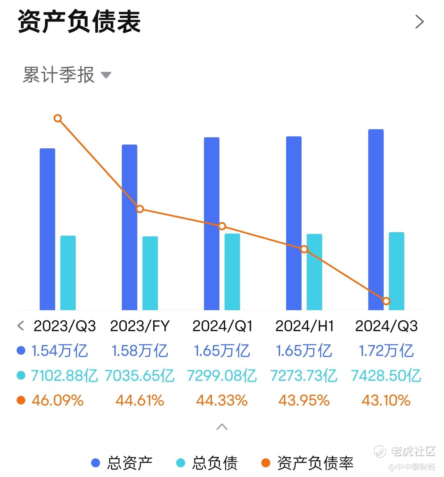 截至2024年9月30日,该公司总资产达到1.72万亿,其中,流动资产占比较大,主要包括现金及现金等价物、应收账款、存货等。非流动资产主要包括长期投资、固定资产、无形资产等。从资产结构来看,该公司拥有充足的流动资产,能够保障公司的短期偿债能力和日常运营需要。