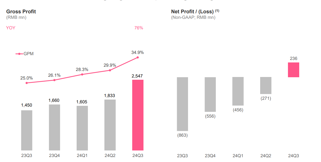 非GAAP净利润为2.36亿元人民币,较去年同期的亏损有所改善,与市场预期相比略显不足。分析师原本预计每股收益为0.54元人民币,而实际为0.57元人民币。
