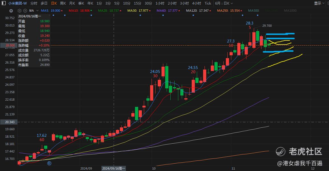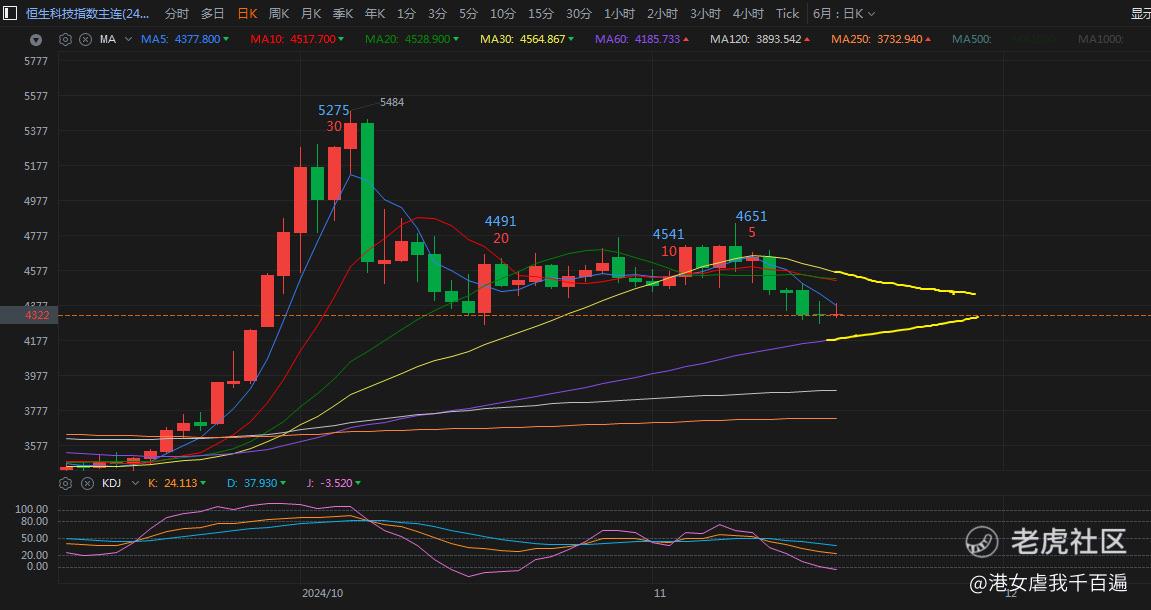 港股本周非常非常弱,没有反弹,而是沿着5天线一路向下破位,恒指跌破20000点后,回落到MA60,现在被MA5死死压着,下周需要时间过渡,科指比恒指好一些,仍然勉强在此前的大横盘区间底部4300附近挣扎,在下面就是MA60的4200支撑。确实在特朗普当选后的港股市场气氛差了不少,同时美元的持续强势相信也是重要影响因素之一。恒指现在这个向下的波段已经形成,除非下周能出来一根大阳线回到20000点上方,这样就能走出左侧底部,压力在20010附近,另外下周初段20500附近是大压力,下方没有什么有力支撑了,19330这个低位再破就是看月线支撑的19270。科指就看MA60的支撑,不破位的话以时间换空间相信能拐回去,下周最大压力4540