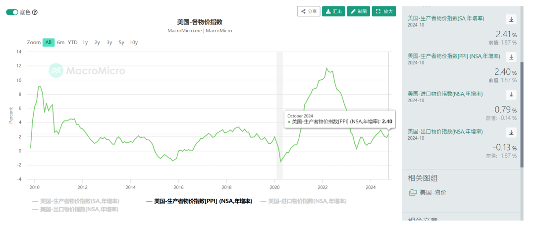 PPI数据与核心PPI高于预期,符合制造业PMI价格指数。PPI同比增2.4%,核心PPI同比增3.1%,都高于预期,前值也都小幅上修。细分项目里面,金融管理占据了服务业1/3的升幅,而商品价格从跌0.2%变成升0.1%。美联储主席鲍威尔指出,数据整体符合预期,但和PCE相关的部分升幅较高,预期10月PCE同比增2.3%,核心PCE同比增2.8%,均再加速。笔者认为,考虑到基数和传导效应,下个月的CPI报告不容乐观,打击美联储12月降息25个基点的行动。