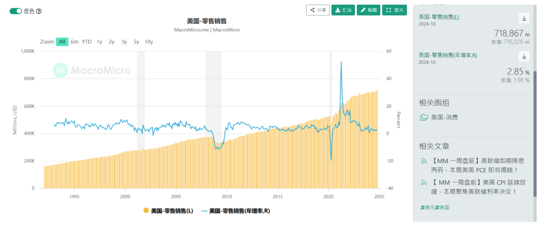 零售数据高于预期,前值上修。10月零售环比增0.4%,同比增2.85%,核心零售环比增0.1%,前值上修为增1%,零售对照小组环比跌0.1%,前值上修为增1.2%;9月零售上修为环比增0.8%,同比增1.98%。