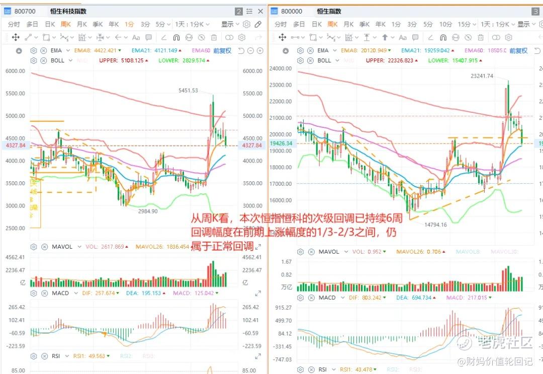 同时,从周K看,本次恒指、恒科的次级反应运动持续时间已达六周(正常范围:3周-数月),