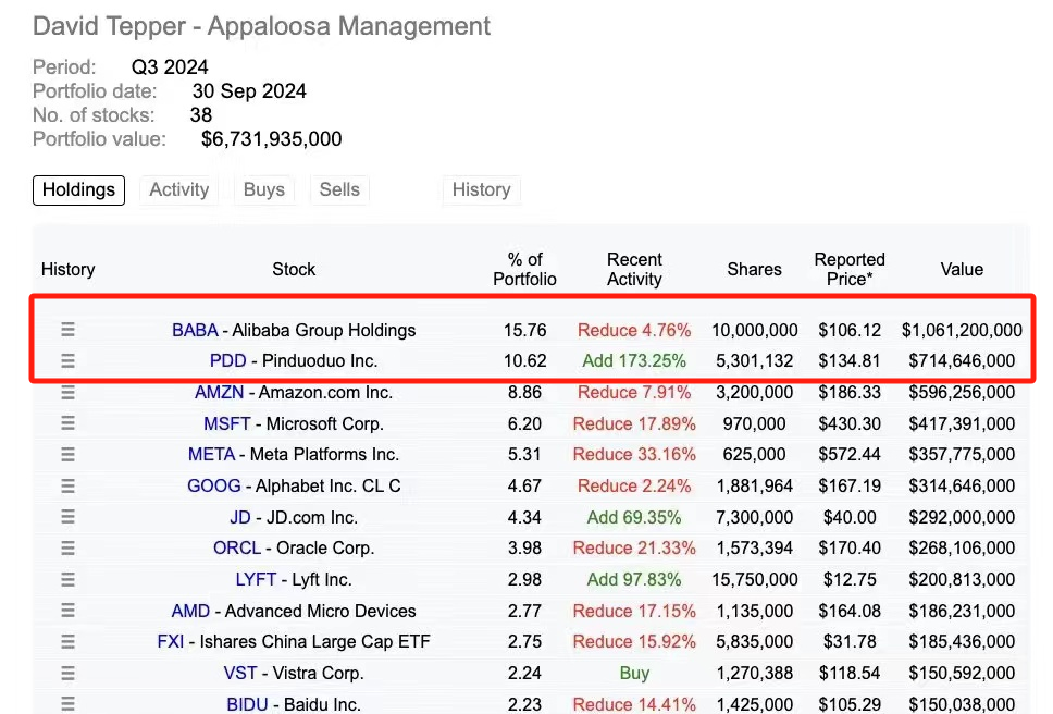 华尔街对冲基金大佬David Tepper、橡树资本、《大空头》原型迈克尔·伯瑞(Michael Burry),还有知名私募高瓴、高毅、段永平等,都提高了各自中概股的仓位,以扬言buy China everything的David Tepper为例,Q3加仓拼多多高达336万股,持仓市值近7.15亿美元。[开心]