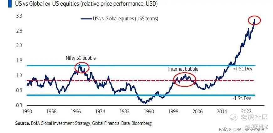 自本月初特朗普/共和党意外获得压倒性完胜以来,全球股市的命运出现了显著变化:美国股市暴涨,飙升 1.8 万亿美元,而另一方面,新兴市场市值蒸发了 5000 亿美元,EAFE(欧洲、澳大利亚和远东,下同)市值下跌了 0.6 万亿美元。美股一枝独秀,也就是投资者全盘押注特朗普 2.0,这相当于“美国例外主义”, 因此配置者很难称美国资产价格狂飙达到顶峰,但随着美元(指实际汇率)目前处于 55 年来的最高水平,美国股市相对于全球股市的领先比率处于 75 年来的最高水平(见图表1)。
